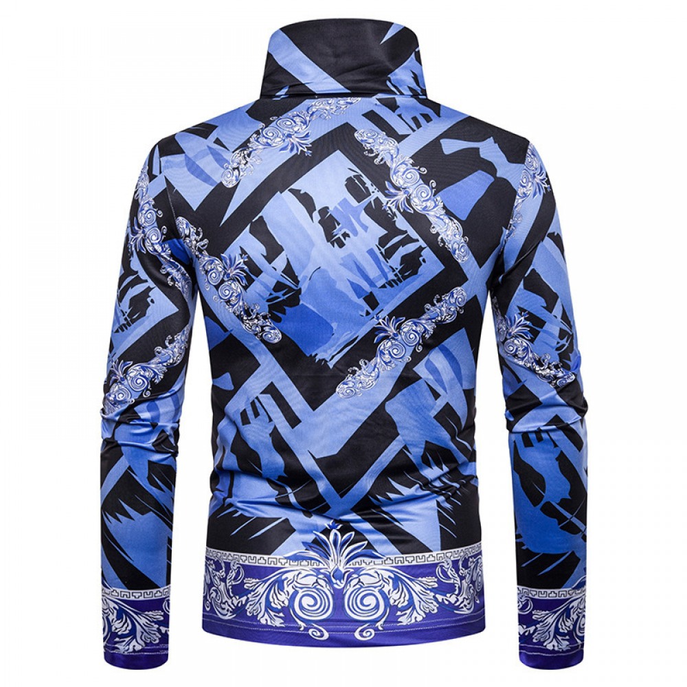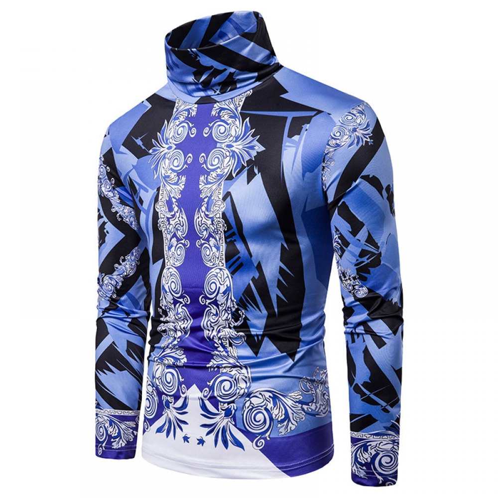 Men's Large Size 3D Blue Pattern Printing High Neck Long Sleeve T-Shirt Bottoming Shirt
